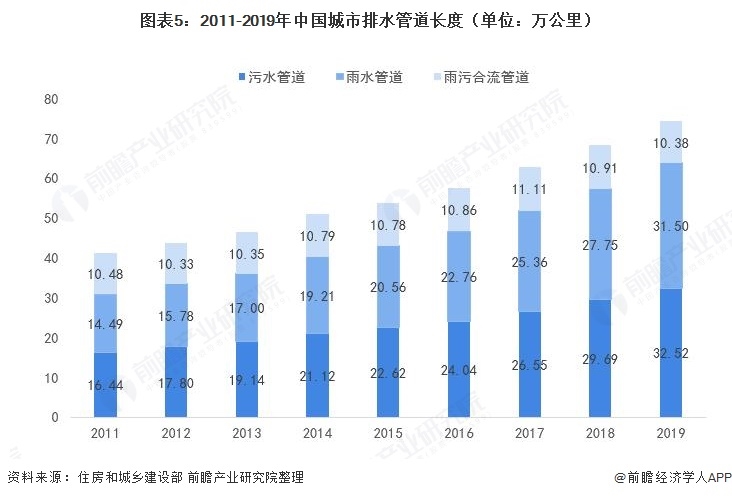 從我國城市排水系統(tǒng)的發(fā)展現(xiàn)狀來看,近年來,我國城市排水管道長度持續(xù)增長。2019年,全國城市排水管道增加至74.40萬公里,同比增長8.85%。其中,污水管道和雨水管道分別為32.52和31.50萬公里,占比為44%和42%;雨污合流管道為10.38萬公里,占比為14%。