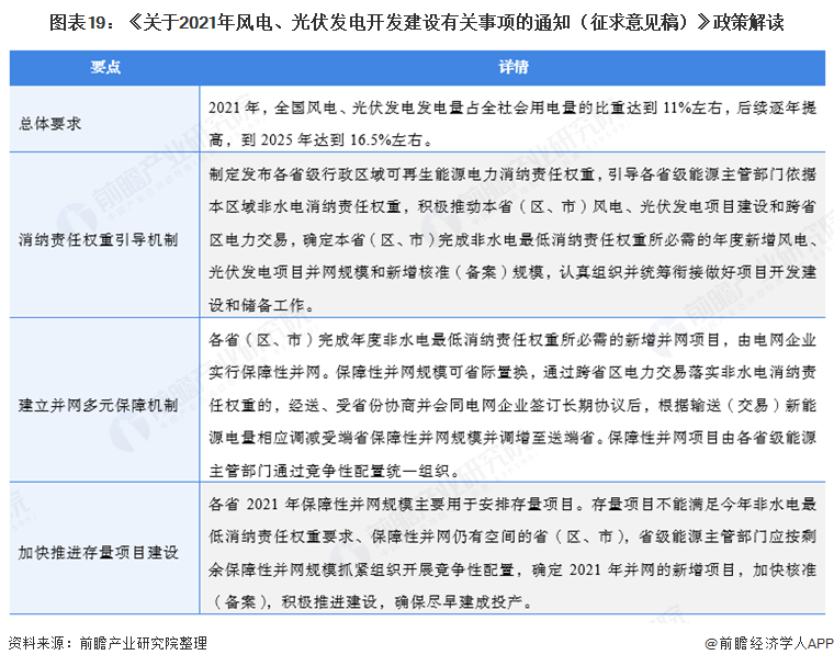 在2021年2月26日,國(guó)家能源局發(fā)布了《關(guān)于2021年風(fēng)電、光伏發(fā)電開(kāi)發(fā)建設(shè)有關(guān)事項(xiàng)的通知(征求意見(jiàn)稿)》指出2021年風(fēng)電、光伏發(fā)電發(fā)電量占全社會(huì)用電量的比重達(dá)到11%左右,同時(shí)要求落實(shí)2030年前碳達(dá)峰、2060年前碳中和,2030年非化石能源占一次能源消費(fèi)比重達(dá)到25%左右,風(fēng)電、太陽(yáng)能發(fā)電總裝機(jī)量達(dá)到12億千瓦以上等目標(biāo)。