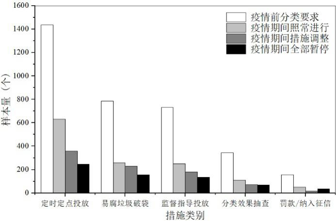 社區(qū)垃圾分類的推進對于疫情防控措施落實有明顯助益,作用機制可能是從社區(qū)工作組織和居民行為意識兩方面進行提升(圖1)。分類越好的社區(qū)所采取的防疫及防疫分類措施越完善、居民防疫意識越強。針對垃圾分類與疫情防控工作間雙向促進特點,在社區(qū)工作推進過程中,應從兩項工作中互相汲取經驗,凝練共性特征強化社區(qū)治理能力,提升居民素質。利用同步推進中的正協(xié)同效應,在組織部署工作時應統(tǒng)籌兼顧,抓住“疫后窗口期”,順應愛國衛(wèi)生運動大勢,在鞏固防疫成效基礎上大力推進社區(qū)垃圾分類工作。疫情期間生活垃圾分類體系的響應主要表現(xiàn)在調停分類措施與新增防疫措施兩方面。55.3%已開展分類社區(qū)做出分類調停改變,其中16.6%暫停了全部垃圾分類工作,措施調整則以暫停易腐垃圾破袋(59.8%)、撤除督導人員(56%)等人工依賴性高措施為主。85.5%社區(qū)新增防疫相關分類措施,新增措施以增設口罩專用收集桶(54.0%)、收集箱集中定點消殺(34.2%)為主,社區(qū)調整與新增措施比例及程度隨疫情風險增高而加大。疫情驗證了定時定點模式推廣可行性,凸顯智能化分類模式在無人監(jiān)管、無接觸條件下維持分類監(jiān)管力度、保障分類質量的巨大優(yōu)勢,應進一步挖掘智能化分類模式應用潛能。