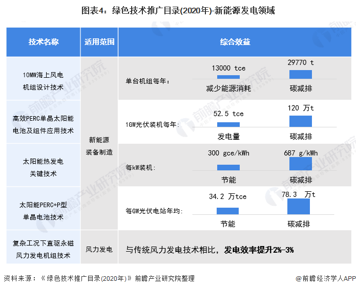 在發(fā)展重點(diǎn)方面,根據(jù)《綠色技術(shù)推廣目錄(2020年)》及相關(guān)規(guī)劃,風(fēng)能、太陽(yáng)能發(fā)電技術(shù)是新能源發(fā)電技術(shù)的發(fā)展重點(diǎn),其中,有2項(xiàng)風(fēng)電技術(shù)入選《目錄》,有3項(xiàng)太陽(yáng)能發(fā)電技術(shù)入選《目錄》,每項(xiàng)技術(shù)的節(jié)能、碳減排效益如下: