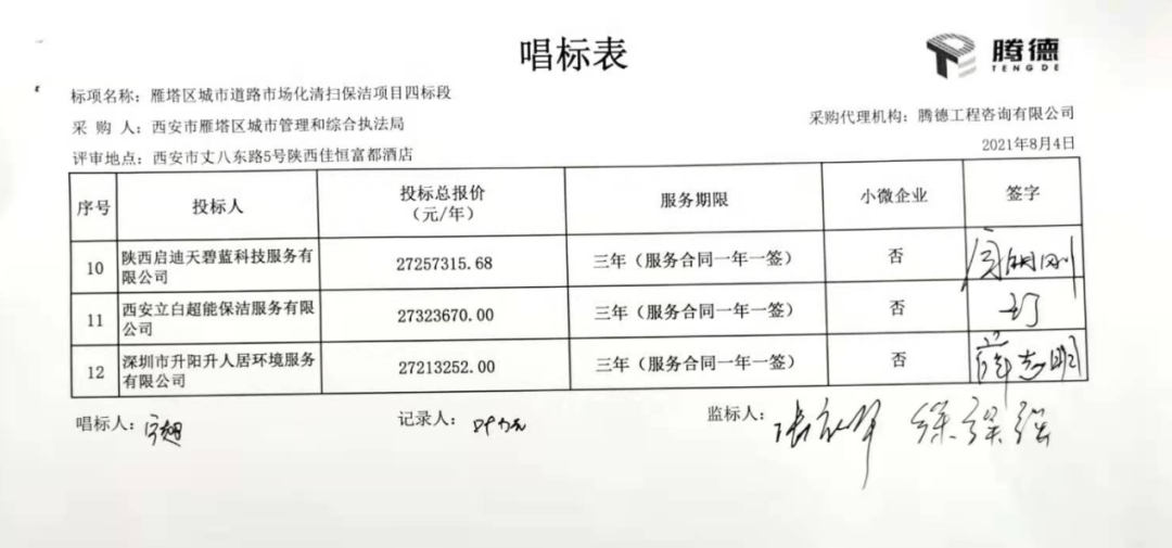 四標(biāo)段共有12家投標(biāo)企業(yè)參與報(bào)價(jià),西安德潤環(huán)境有限公司勝出,成交價(jià)27,269,988元/年,服務(wù)期3年。