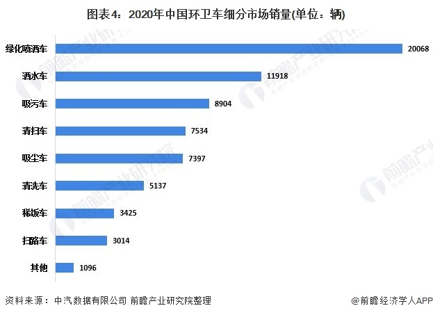 從各功能車輛種類來看,2020年綠化噴灑車、灑水車、吸污車、清掃車、吸塵車五類車型的比重總占比達(dá)到80%以上。其中,綠化噴灑車市場占比高達(dá)30%,銷量為20068輛,同比增長19.1%。