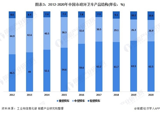 從車型結(jié)構(gòu)來看,重型產(chǎn)品的比重已經(jīng)從2012年的46.5%增長到2020年的62.5%。從近幾年的產(chǎn)品結(jié)構(gòu)趨勢來看,市政環(huán)衛(wèi)產(chǎn)品重型化趨勢十分明顯,重型產(chǎn)品的比重不斷提升,中型產(chǎn)品市場份額受到擠壓,同時(shí)輕型產(chǎn)品份額也有所提升,產(chǎn)品呈現(xiàn)出向重型、輕型兩極發(fā)展的趨勢。