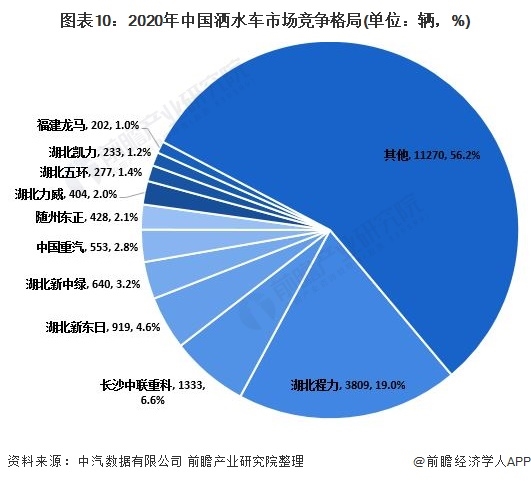 在灑水車市場中,銷量TOP10企業(yè)集中度為43.8%,較2019年同期下滑了16個(gè)百分點(diǎn),企業(yè)集中度大幅下滑。其中湖北程力專用汽車有限公司銷量達(dá)到3809輛,市場份額占比為19.0%。