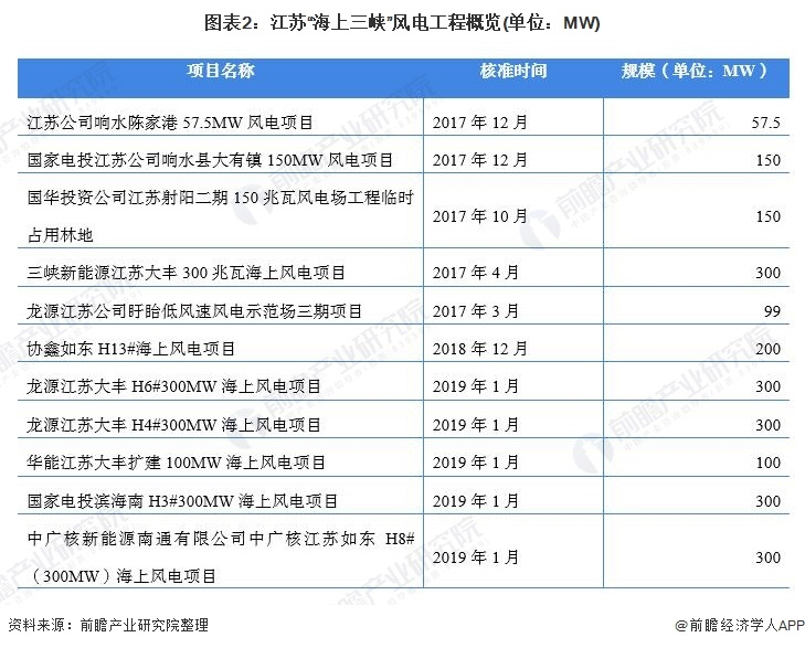 同時,江蘇省風(fēng)電場建設(shè)起步較早。早在2004年,全國第一個風(fēng)電特許權(quán)項目就落戶在江蘇省南通如東。2006年,江蘇省首座風(fēng)電場——南通如東龍源風(fēng)電場便建成。截止2018年底,江蘇省共投運56座風(fēng)電場。2019年,江蘇省發(fā)改委對外公布了24個新核準海上風(fēng)電項目,投資規(guī)模達1222.85億元、裝機規(guī)模670萬千瓦。其中,南通海域項目13個,鹽城海域項目11個。加上此前并網(wǎng)發(fā)電的302.5萬千瓦已建項目,江蘇“海上三峽”風(fēng)電工程全部敲定。