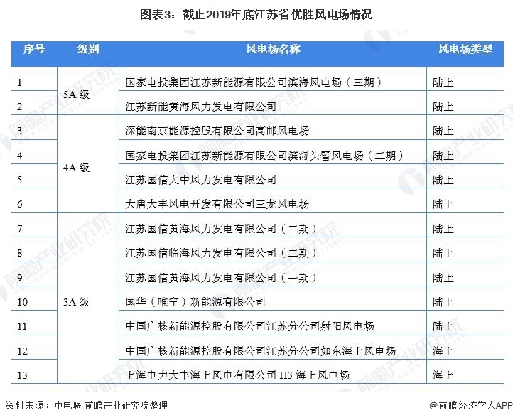 截止2019年底,江蘇省共有13個優(yōu)勝風(fēng)電場,全國排名第9,其中5A級有2個,4A級有4個,3A級有7個。按風(fēng)電場類型分類,江蘇省入選的優(yōu)勝風(fēng)電場有11個是陸上風(fēng)電場,2個是海上風(fēng)電場。