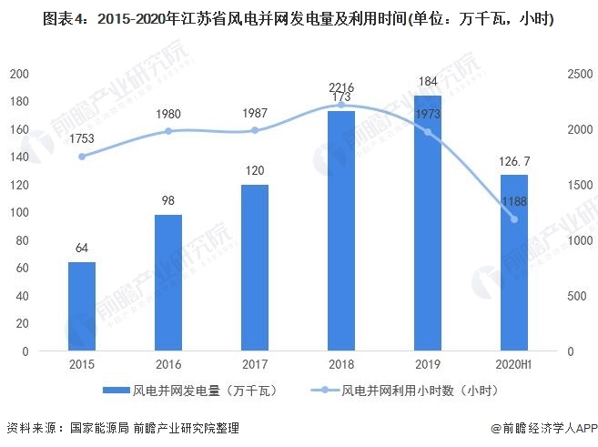在利用小時方面,江蘇省風(fēng)電并網(wǎng)利用小時數(shù)在2019年有所下滑,同比下滑10.97%。2020年上半年,江蘇省風(fēng)電并網(wǎng)利用小時為1188小時。