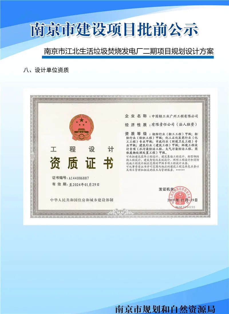 該項(xiàng)目的建設(shè)單位為南京江北環(huán)保電力有限公司,設(shè)計(jì)單位為中國(guó)輕工業(yè)廣州工程有限公司。