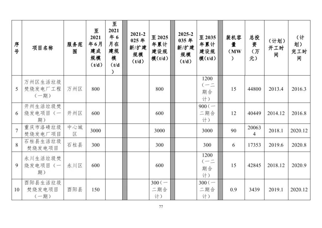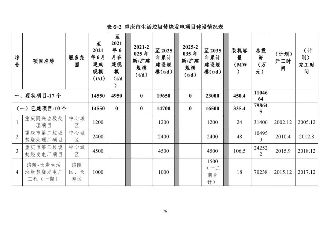 重慶市生活垃圾焚燒發(fā)電項(xiàng)目建設(shè)情況表