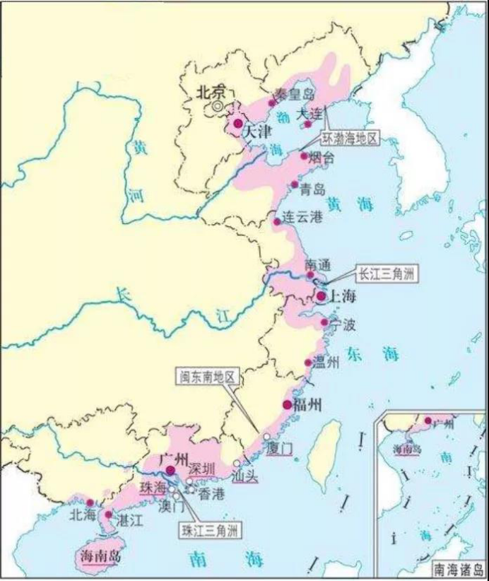根據(jù)2012版《中國海洋統(tǒng)計年鑒》,我國大陸海岸線長達(dá)1.8萬km,包括9個沿海?。ㄟ|寧、河北、山東、江蘇、浙江、福建、廣東、海南)、1個自治區(qū)(廣西)、2個直轄市(上海、天津);53個沿海城市、242個沿海區(qū)縣。