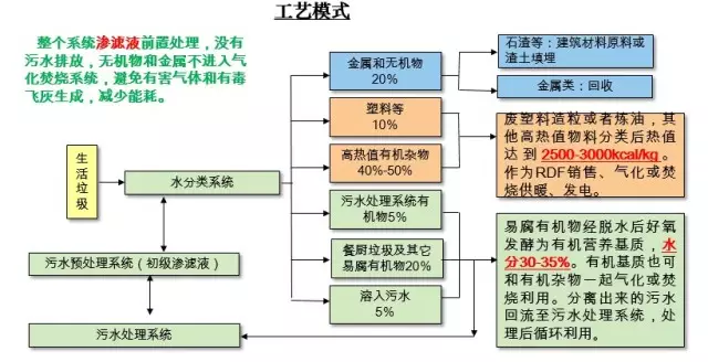 以自有研發(fā)的垃圾水分類技術(shù)為核心和前提,結(jié)合并優(yōu)化現(xiàn)有垃圾分類方法、資源再生技術(shù)的垃圾處理方法,整個(gè)系統(tǒng)滲濾液前置處理,沒(méi)有污水排放,無(wú)機(jī)物和金屬不進(jìn)入氣化焚燒系統(tǒng),避免有害氣體和有毒飛灰生成,減少能耗。以其恩施項(xiàng)目為典型案例,對(duì)其具有自主專利的垃圾水分類技術(shù)進(jìn)行了全面的介紹,具有綜合利用率80%以上,無(wú)二次污染,清洗水全部經(jīng)處理回用,氣化燃?xì)夂蜔煔馀欧胚_(dá)標(biāo)無(wú)隱患等技術(shù)特點(diǎn)。