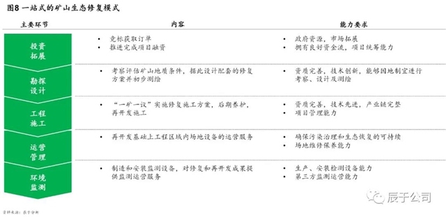 參考國(guó)際成熟經(jīng)驗(yàn),我們認(rèn)為未來(lái)EPC仍然是主流模式。不過(guò)隨著推進(jìn)大礦山生態(tài)修復(fù)勢(shì)在必行,預(yù)計(jì)PPP項(xiàng)目數(shù)量將有所增加,尤其是遼寧、河南、山東、內(nèi)蒙古等礦山生態(tài)修復(fù)走在前列的省份值得關(guān)注。當(dāng)然,這對(duì)入局企業(yè)也提出了更高要求,他們不僅要有較強(qiáng)的政府資源和市場(chǎng)拓展能力,還要關(guān)注礦山生態(tài)修復(fù)多環(huán)節(jié)的打通,提升諸如生態(tài)環(huán)境考察評(píng)估、破壞診斷、方案設(shè)計(jì)、修復(fù)系統(tǒng)構(gòu)造、生態(tài)景觀(guān)建設(shè)、系統(tǒng)跟蹤與維護(hù)、環(huán)境監(jiān)測(cè)等各項(xiàng)能力,打造一站式整體修復(fù)模式(見(jiàn)圖8)。