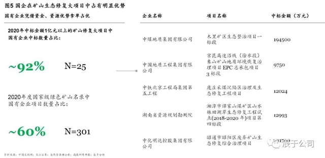 這四類(lèi)企業(yè)中,具有國(guó)資背景的企業(yè)在大項(xiàng)目中標(biāo)占有明顯優(yōu)勢(shì),據(jù)不完全統(tǒng)計(jì),2020年中標(biāo)金額1億元以上的礦山生態(tài)修復(fù)大項(xiàng)目中,90%以上為國(guó)有企業(yè);301個(gè)國(guó)家級(jí)綠色礦山名錄中,60%以上是國(guó)有企業(yè)(見(jiàn)圖5)。