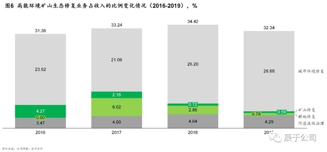 由于市場(chǎng)潛力并未有效釋放,土壤修復(fù)企業(yè)參與這一市場(chǎng)較為謹(jǐn)慎,包括高能環(huán)境、中科鼎實(shí)、建工修復(fù)等龍頭在礦山生態(tài)修復(fù)領(lǐng)域的參與項(xiàng)目很少。以高能環(huán)境為例,近年來(lái)礦山生態(tài)修復(fù)占總收入的比重不升反降,2016年這一數(shù)字為4.27%,2019年則僅為0.59%(見(jiàn)圖6)。