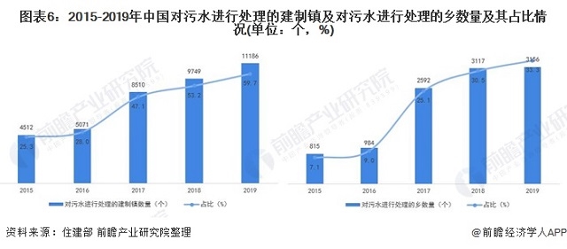 圖表6:2015-2019年中國對污水進行處理的建制鎮(zhèn)及對污水進行處理的鄉(xiāng)數(shù)量及其占比情況(單位:個,%)