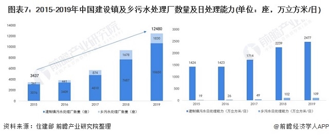 自2015年以來,我國農村污水廠數(shù)量飛速增長,污水處理能力穩(wěn)步提升,建設鎮(zhèn)及鄉(xiāng)污水處理廠數(shù)量由2015年的3437座增長至2019年的12480座,增速高達三倍左右。截止2019年底,我國建設鎮(zhèn)及鄉(xiāng)污水日處理能力分別達到了2477萬立方米/日和109萬立方米/日。