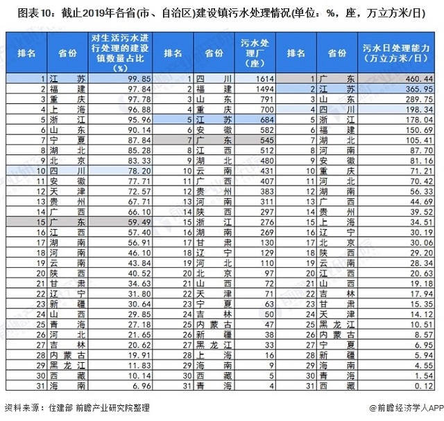 圖表10:截止2019年各省(市、自治區(qū))建設鎮(zhèn)污水處理情況(單位:%,座,萬立方米/日)