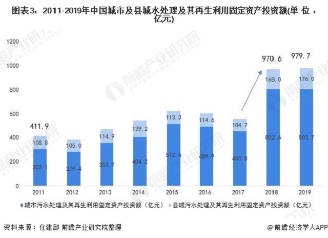 在投資額方面,2011-2017年,我國城市及縣城污水處理及其再生利用固定資產投資額維持在350-650億元區(qū)間范圍內。2018年,我國城市及縣城污水處理及其再生利用固定資產投資額大幅增長,達到970.6億元,2019年投資額再創(chuàng)新高,達到979.7億元。