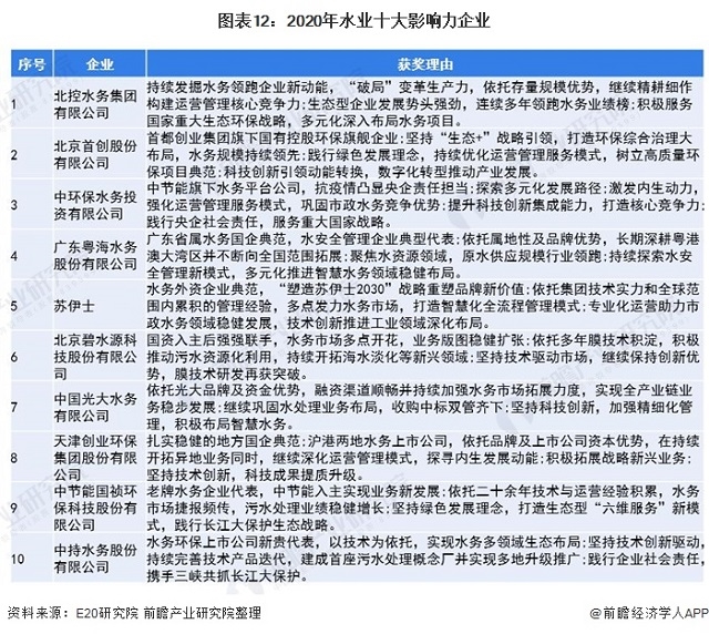 注:E20研究院根據(jù)企業(yè)的業(yè)績以及他們在資本市場、穩(wěn)健運營、企業(yè)社責任等方面的綜合評價出2020水業(yè)十大影響力企業(yè)。