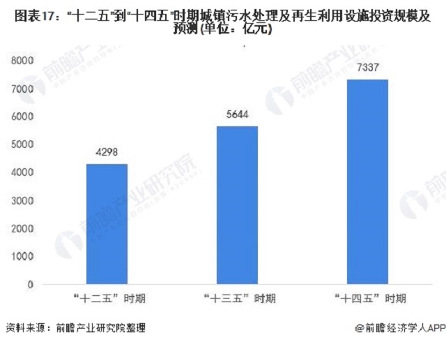 根據(jù)“十三五”規(guī)劃中針對水環(huán)境治理領域的投資規(guī)模,同時結合新時期的農村水環(huán)境治理與幾大流域生態(tài)治理的工程總量與復雜程度綜合分析,前瞻判斷“十四五”規(guī)劃中針對水環(huán)境治理的投資規(guī)模或進一步升級加碼至7337億元。中國污水處理市場仍有較大發(fā)展空間。