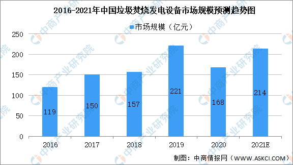 焚燒爐作為垃圾焚燒處理系統(tǒng)最核心的設(shè)備,其設(shè)計需充分考慮垃圾停留時間、燃燒溫度、煙氣在爐內(nèi)的停留時間及紊流等因素,從而達到完全燃燒、控制惡臭及二惡英類物質(zhì)產(chǎn)生的目的。目前國內(nèi)外應(yīng)用較多、技術(shù)比較成熟的生活垃圾焚燒爐主要包括流化床焚燒爐、爐排爐型焚燒爐等。2020年,垃圾焚燒發(fā)電設(shè)備市場規(guī)模約為168億元。預(yù)計2021年我國垃圾焚燒發(fā)電設(shè)備市場規(guī)模可達214億元。