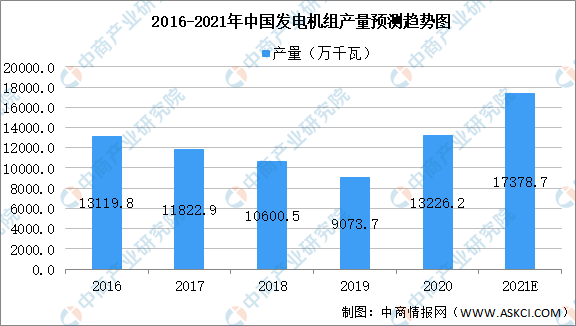 一般我們常見的發(fā)電機組通常由汽輪機、水輪機或內(nèi)燃機(汽油機、柴油機等發(fā)動機)驅(qū)動,可再生新能源包括核能、風能、太陽能、生物質(zhì)能、海洋能等。數(shù)據(jù)顯示,我國發(fā)電機組產(chǎn)量呈波動趨勢,2020年我國發(fā)電機組產(chǎn)量達13226.2萬千瓦,預(yù)計2021年我國發(fā)電機組產(chǎn)量可達17378.7萬千瓦。