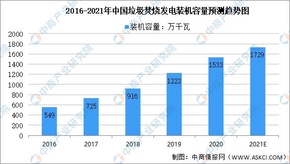 數(shù)據(jù)顯示,我國垃圾焚燒發(fā)電裝機容量由2016年549萬千瓦增至2020年1533萬千瓦,年均復(fù)合增長率為29.27%。中商產(chǎn)業(yè)研究院預(yù)測,2021年垃圾焚燒發(fā)電裝機容量可達1729萬千瓦。
