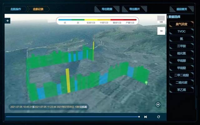 此次走航期間,僅發(fā)現(xiàn)2處臭氣濃度監(jiān)測數(shù)值相對較高的區(qū)域。第一個高值區(qū)域為某新材料公司二期廠區(qū),走航車經(jīng)過該區(qū)域時,走航地圖顯示臭氣濃度以黃色柱形圖顯示,屬輕度污染,結(jié)合導出的走航數(shù)據(jù)發(fā)現(xiàn),該區(qū)域的臭氣濃度監(jiān)測因子最高值達到13(OU),雖未超標,但略高于其他區(qū)域監(jiān)測數(shù)值;第二個高值區(qū)域為某氣體生產(chǎn)單位廠區(qū)附近,現(xiàn)場人員經(jīng)過該區(qū)域時能夠聞到空氣中的臭味,因此在該區(qū)域進行了短暫的停留,后結(jié)合導出的走航地圖及走航數(shù)據(jù)發(fā)現(xiàn),該區(qū)域的臭氣濃度監(jiān)測因子數(shù)值最高達到19(OU),也未超過國家二級標準規(guī)定的20(OU)濃度要求。綜合分析,本次走航監(jiān)測區(qū)域整體空氣質(zhì)量較為優(yōu)良,無長時間、氣味明顯的惡臭污染,但應該針對某新材料公司和某氣體生產(chǎn)企業(yè)進行重點監(jiān)控。本次走航監(jiān)測,為當?shù)丨h(huán)境部門進行重點區(qū)域惡臭污染排查提供了可靠的數(shù)據(jù)支撐,對于敦促企業(yè)進行整改、確保該市環(huán)境空氣質(zhì)量維持優(yōu)良水平貢獻出了一份力量。