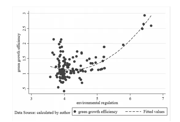 最后,文章進(jìn)一步討論了環(huán)境規(guī)制對(duì)不同污染排放強(qiáng)度的行業(yè)的影響。回歸結(jié)果顯示環(huán)境規(guī)制對(duì)中高污染行業(yè)具有顯著的“U”型曲線效應(yīng)。并且根據(jù)數(shù)值計(jì)算,當(dāng)曲線達(dá)到最小值時(shí),對(duì)于高污染和中等污染行業(yè),對(duì)應(yīng)的環(huán)境規(guī)制數(shù)值分別為3.92和4.54。而七個(gè)高污染行業(yè)中,多數(shù)行業(yè)的環(huán)境規(guī)制數(shù)值均超過(guò)3.92,表明環(huán)境規(guī)制對(duì)高污染行業(yè)的綠色增長(zhǎng)具有正向影響。相比之下,七個(gè)中污染行業(yè)的環(huán)境監(jiān)管強(qiáng)度未超過(guò)4.54,表明環(huán)境規(guī)制對(duì)這些行業(yè)綠色增長(zhǎng)的影響仍然是負(fù)面的??赡茉蚴侵形廴拘袠I(yè)還不是環(huán)境政策所重點(diǎn)監(jiān)管的對(duì)象。