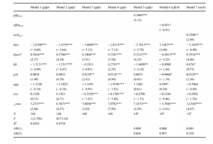 表1中的(1)-(4),作者分別采用了固定效應(yīng)、雙向固定效應(yīng)、隨機(jī)效應(yīng)和FGLS進(jìn)行估計(jì),模型(5)-(7)顯示了基于系統(tǒng)GMM方法的估計(jì)結(jié)果。經(jīng)過(guò)模型設(shè)定的一系列檢驗(yàn),作者以系統(tǒng)GMM的估計(jì)結(jié)果討論了實(shí)證檢驗(yàn)的結(jié)果。從模型(5)來(lái)看,lner系數(shù)為負(fù),而二次項(xiàng)為正,并且都通過(guò)了顯著性檢驗(yàn)。證明了環(huán)境規(guī)制與制造業(yè)綠色增長(zhǎng)之間存在的“U”型關(guān)系。根據(jù)估計(jì)系數(shù),當(dāng)環(huán)境規(guī)制強(qiáng)度為4.6時(shí),曲線達(dá)到最小值。另外,根據(jù)模型(6)和模型(7)的回歸結(jié)果來(lái)看,環(huán)境規(guī)制對(duì)技術(shù)進(jìn)步的影響呈“U”形關(guān)系,而對(duì)于技術(shù)效率指數(shù),則呈倒“U”形關(guān)系。