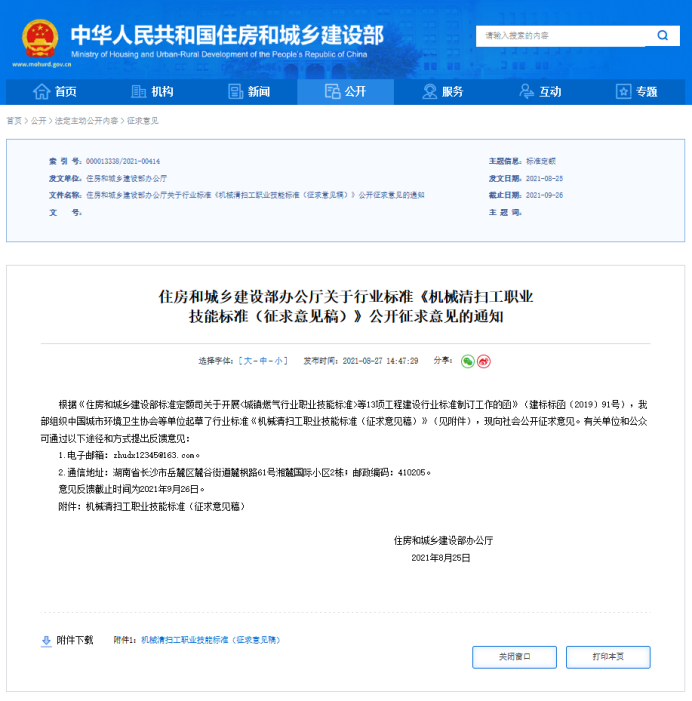 近日,從住房和城鄉(xiāng)建設(shè)部官網(wǎng)獲悉,住房和城鄉(xiāng)建設(shè)部辦公廳正依據(jù)《住房和城鄉(xiāng)建設(shè)部標(biāo)準定額司關(guān)于開展等13項工程建設(shè)行業(yè)標(biāo)準制訂工作的函》(建標(biāo)標(biāo)函〔2019〕91號),就《保潔員職業(yè)技能標(biāo)準》《機械清掃工職業(yè)技能標(biāo)準》《垃圾處理工職業(yè)技能標(biāo)準》等進行意見征求。其中,《機械清掃工職業(yè)技能標(biāo)準(征求意見稿)》由中國城市環(huán)境衛(wèi)生協(xié)會等單位起草,《保潔員職業(yè)技能標(biāo)準(征求意見稿)》由廣東省環(huán)境衛(wèi)生協(xié)會等單位起草,《垃圾處理工職業(yè)技能標(biāo)準(征求意見稿)》由華中科技大學(xué)等單位起草。根據(jù)上述三則征求意見稿的精神,納入三則征求意見稿的環(huán)衛(wèi)工種,其從業(yè)人員有望獲得職業(yè)技能認定。下列環(huán)衛(wèi)工種有望獲得職業(yè)技能認定納入《保潔員職業(yè)技能標(biāo)準》征求意見的環(huán)衛(wèi)工種,包括清掃保潔工、公廁保潔員、水域保潔員、高空外墻清洗員;納入《機械清掃工職業(yè)技能標(biāo)準》征求意見的環(huán)衛(wèi)工種,包括機械掃路工、機械沖洗工、機械疏通工、機械除雪工、船舶輪機工(員);納入《垃圾處理工職業(yè)技能標(biāo)準》的環(huán)衛(wèi)工種,包括生活垃圾填埋處理工、生活垃圾焚燒處理工、生活垃圾堆肥處理工、廚余垃圾處理工、大件垃圾處理工、園林垃圾處理工、建筑(裝修)垃圾處理工、糞便處理工、垃圾分選工。環(huán)衛(wèi)工種由低到高分為哪些等級?根據(jù)三則征求意見稿,環(huán)衛(wèi)從業(yè)人員日后或可根據(jù)自己所從事的工作屬性,通過申報和考核程序獲得職業(yè)技能等級評定,其中:保潔員職業(yè)技能等級由低到高可分為:職業(yè)技能五級(初級工)、職業(yè)技能四級(中級工)、職業(yè)技能三級(高級工);機掃工職業(yè)技能等級由低到高可分為五級:職業(yè)技能五級(初級工)、職業(yè)技能四級(中級工)、職業(yè)技能三級(高級工)、職業(yè)技能二級(技師)和職業(yè)技能一級(高級技師);垃圾處理工職業(yè)技能等級由低到高可分為:職業(yè)技能五級、職業(yè)技能四級、職業(yè)技能三級、職業(yè)技能二級和職業(yè)技能一級。 鼓勵環(huán)衛(wèi)工人通過進修更高等級的職業(yè)資格認定征求意見稿鼓勵環(huán)衛(wèi)工人通過進修獲得使用相關(guān)機械的資質(zhì),或者通過進修提升文化水平獲得更高等級的職業(yè)資格認定。如最高等級只到三級的保潔員,可按照環(huán)境衛(wèi)生服務(wù)行業(yè)其他工種的職業(yè)技能要求申報更高等級;如具有大專及以上本專業(yè)或相關(guān)專業(yè)畢業(yè)證書,并取得本職業(yè)或相關(guān)職業(yè)四級職業(yè)資格證書后,累計從事本職業(yè)或相關(guān)職業(yè)工作2年(含)以上者,可申報垃圾處理工職業(yè)技能三級;具有大專及以上本專業(yè)或相關(guān)專業(yè)畢業(yè)證書,累積從事本職業(yè)工作1年(含)及以上,可申報機掃工職業(yè)技能三級(高級工)。據(jù)悉,隨著國內(nèi)各城市的發(fā)展,不少城市近年來紛紛鼓勵環(huán)衛(wèi)工人通過提升職業(yè)技能,引導(dǎo)環(huán)衛(wèi)工人從單純使用簡單工具進行路面保潔轉(zhuǎn)型為可使用或駕駛各類機械參與更精細化的保潔工作,也鼓勵有條件的環(huán)衛(wèi)工人通過進修文化課獲得更高等的學(xué)位轉(zhuǎn)型為管理人員。備注:以上部分內(nèi)容節(jié)選自羊城派《這些環(huán)衛(wèi)工種擬進行職業(yè)技能認定!未來更有奔頭》。關(guān)于行業(yè)標(biāo)準《機械清掃工職業(yè)技能標(biāo)準根據(jù)《住房和城鄉(xiāng)建設(shè)部標(biāo)準定額司關(guān)于開展<城鎮(zhèn)燃氣行業(yè)職業(yè)技能標(biāo)準>等13項工程建設(shè)行業(yè)標(biāo)準制訂工作的函》(建標(biāo)標(biāo)函〔2019〕91號),我部組織中國城市環(huán)境衛(wèi)生協(xié)會等單位起草了行業(yè)標(biāo)準《機械清掃工職業(yè)技能標(biāo)準(征求意見稿)》(見附件),現(xiàn)向社會公開征求意見。有關(guān)單位和公眾可通過以下途徑和方式提出反饋意見:1.電子郵箱:zhudx12345@163.com。2.通信地址:湖南省長沙市岳麓區(qū)麓谷街道麓楓路61號湘麓國際小區(qū)2棟;郵政編碼:410205。附件:機械清掃工職業(yè)技能標(biāo)準(征求意見稿)《機械清掃工職業(yè)技能標(biāo)準(征求意見稿)》下載地址http://219.142.101.111/gongkai/fdzdgknr/zqyj/202108/20210827_761824.html關(guān)于行業(yè)標(biāo)準《保潔員職業(yè)技能標(biāo)準根據(jù)《住房和城鄉(xiāng)建設(shè)部標(biāo)準定額司關(guān)于開展<城鎮(zhèn)燃氣行業(yè)職業(yè)技能標(biāo)準>等13項工程建設(shè)行業(yè)標(biāo)準制訂工作的函》(建標(biāo)標(biāo)函〔2019〕91號),我部組織廣東省環(huán)境衛(wèi)生協(xié)會等單位起草了行業(yè)標(biāo)準《保潔員職業(yè)技能標(biāo)準(征求意見稿)》(見附件),現(xiàn)向社會公開征求意見。有關(guān)單位和公眾可通過以下途徑和方式提出反饋意見:2.通信地址:廣州市天河區(qū)先烈東路121號3號辦公樓3樓;郵政編碼:510500。附件:保潔員職業(yè)技能標(biāo)準(征求意見稿)《保潔員職業(yè)技能標(bi