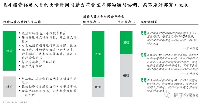 理想狀態(tài)下,對外對內(nèi)工作的時間分配比例應(yīng)該是7:3,甚至更高也不為過,但現(xiàn)實往往相反,由于內(nèi)部協(xié)同效率不高、流程繁冗、“人治”問題嚴(yán)重,我們發(fā)現(xiàn)一些投資拓展人員更多的時間與精力花費在內(nèi)部溝通與協(xié)調(diào),而不是外部客戶攻關(guān)。造成這種現(xiàn)象的原因,表面看上去是內(nèi)部流程繁瑣,決策鏈條冗長,實則是內(nèi)部沒有形成一以貫之以市場為導(dǎo)向、以項目為核心的理念文化。平時大多只是喊喊口號而已,并未真正付諸行動。