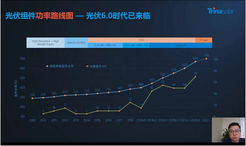 根據(jù)光伏組件功率路線圖顯示,光伏6.0時代已來臨。天合光能主要是在210mm 硅片、無損切割技術(shù)、低電壓設(shè)計、高密度封裝、多分片設(shè)計、MBB等幾大方面進行創(chuàng)新。