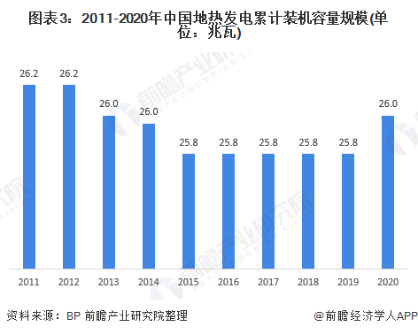 我國(guó)地?zé)崮荛_發(fā)利用處于起步階段有關(guān),關(guān)鍵技術(shù)有待突破。根據(jù)英國(guó)石油公司BP的數(shù)據(jù)顯示,2011-2019年,中國(guó)地?zé)岚l(fā)電累計(jì)裝機(jī)容量一直在25-27兆瓦區(qū)間內(nèi),近五年更是沒有出現(xiàn)過(guò)變動(dòng)。隨著我國(guó)“碳中和”和“碳達(dá)峰”目標(biāo)的確立,中國(guó)地?zé)岚l(fā)電裝機(jī)容量得到增長(zhǎng)。