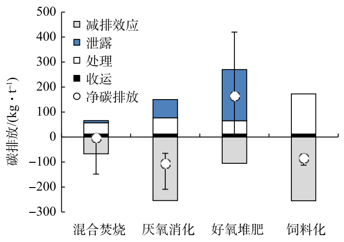 在廚余垃圾處理過(guò)程中,附加碳排放一般不到 50 kg·t?1,收運(yùn)過(guò)程的碳排放也相對(duì)較小,因此系統(tǒng)熱效率、有機(jī)質(zhì)降解率和溫室氣體泄漏率是影響不同處理模式碳排放的主要因素。飼料化和厭氧消化具有最好的碳減排效應(yīng),而混合焚燒的碳減排效應(yīng)可忽略不計(jì)。好氧堆肥受到溫室氣體泄漏的影響,會(huì)產(chǎn)生較多的碳排放,當(dāng)堆肥工藝運(yùn)行良好,無(wú) CH4 和 N2O 排放時(shí),好氧堆肥可產(chǎn)生碳減排效應(yīng)。