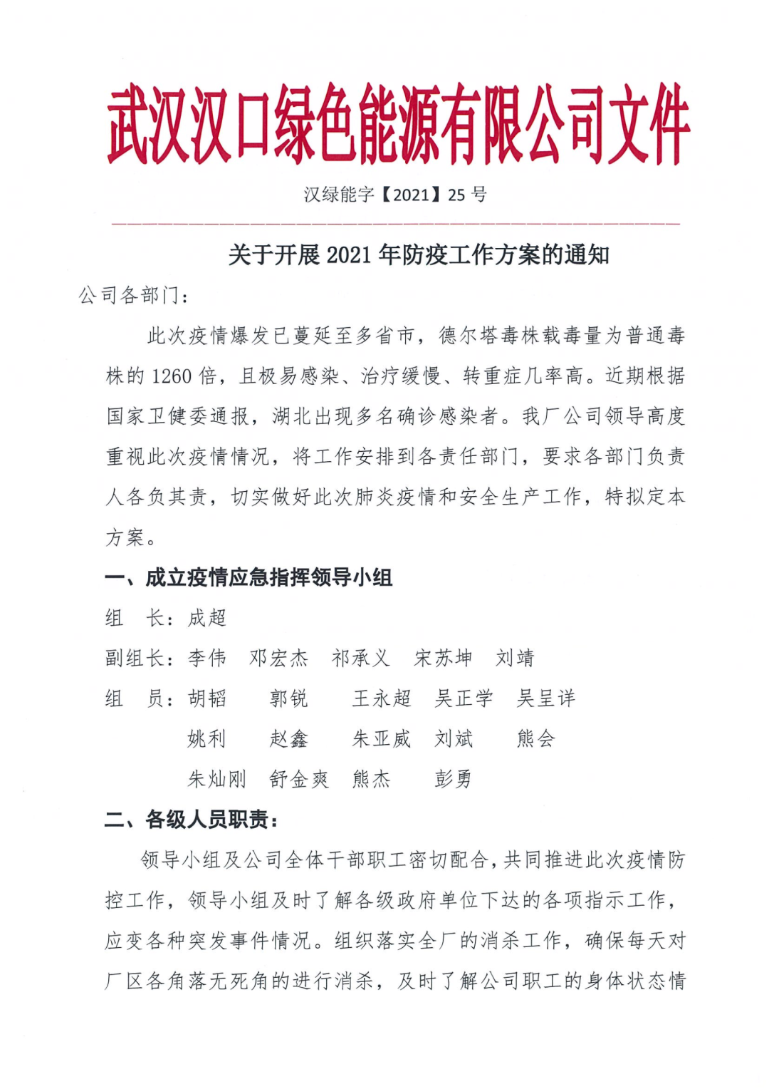 同日,漢口垃圾發(fā)電廠發(fā)布《關(guān)于開展2021年防疫工作方案的通知(漢綠能字【2021】25號)通知》,迅速成立電廠疫情應(yīng)急指揮小組,對各部門、各級人員疫情防控職責(zé)及防疫措施進行了明確。