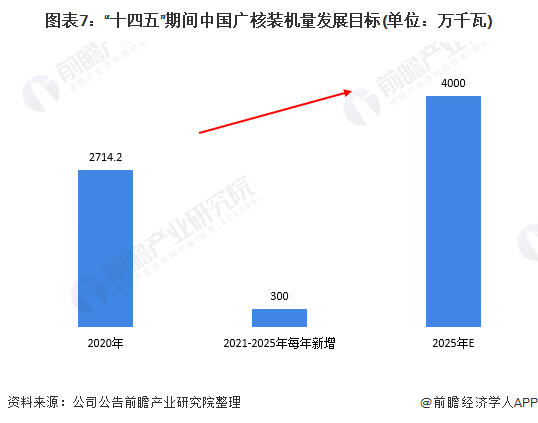 根據(jù)《十四五規(guī)劃和2035年愿景目標(biāo)綱要》,“十四五”期間,我國核電運行裝機容量達到7000萬千瓦。中國廣核作為我國核電行業(yè)的龍頭企業(yè),也提出了其十四五發(fā)展目標(biāo):“十四五”期間,中國廣核將保持每年300萬千瓦以上發(fā)展速度,預(yù)計到“十四五”末,中廣核境內(nèi)新能源在運裝機總?cè)萘繉⑼黄?000萬千瓦。