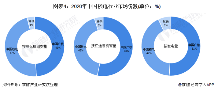 目前,中國核電行業(yè)兩大龍頭企業(yè)分別是中國核電、中國廣核。2020年,按在運機組數(shù)量來看,中國廣核的市場份額達49%,中國核電的市場份額達47%;按在運裝機容量來看,中國廣核的市場份額達53%,中國核電的市場份額達42%;按發(fā)電量來看,中國廣核、中國核電的市場份額分為為51%、42%。