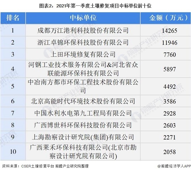 土壤修復行業(yè)屬于技術密集型和資金密集型行業(yè),技術水平是行業(yè)內(nèi)企業(yè)的主要核心競爭力。行業(yè)涉及環(huán)境、土壤、水文、地質(zhì)、生態(tài)、生物、材料、物理、化學等多學科、多領域的知識和技術,具有較高的技術門檻。而“全能型”企業(yè)可進行污染場地調(diào)查、風險評估、修復施工等,業(yè)務基本覆蓋土壤修復各個環(huán)節(jié),更具競爭優(yōu)勢,成為行業(yè)發(fā)展的最大受益者。按照中標金額,2021年一季度土壤修復項目中標單位排名前十單位如下表所示。