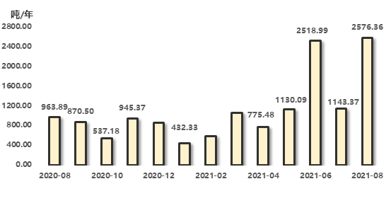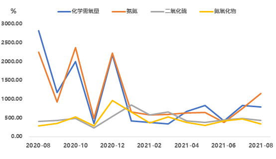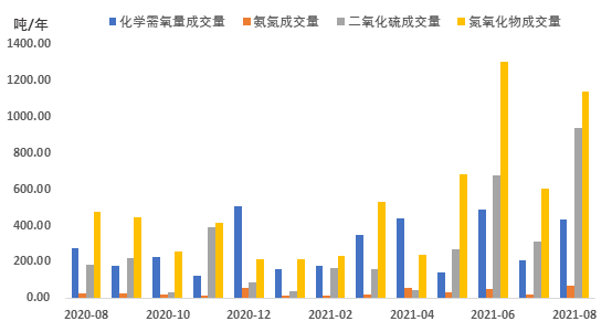 近期排污權(quán)成交量短期收窄后,再次攀升高位。2021年8月,四項(xiàng)排污權(quán)成交量合計(jì)為2576.36噸,環(huán)比上漲125.33%,與上年同期相比上升167.29%。