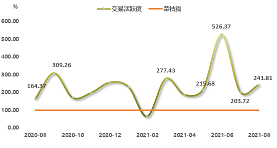 浙江省排污權(quán)交易活躍度小幅回暖。2021年8月,交易活躍度指數(shù)沖高回落后,出現(xiàn)小幅回暖走勢(shì),指數(shù)值收?qǐng)?bào)于241.81點(diǎn),環(huán)比上漲18.69%,與上年同期相比上行47.11%。