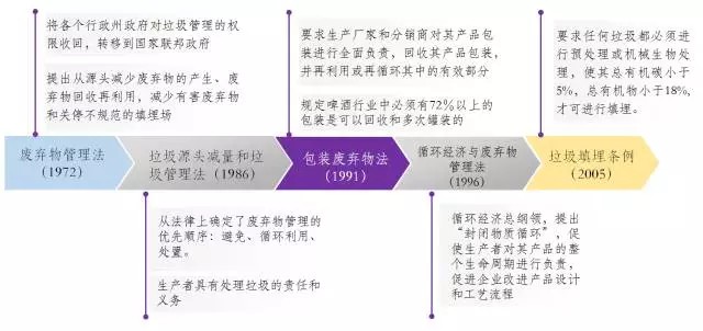 1991年頒布的《包裝廢棄物法》將包裝廢棄物的收集和處理責(zé)任從過去的各個(gè)行政州政府分?jǐn)偨o了各生產(chǎn)廠家、分銷商等企業(yè)機(jī)構(gòu),要求生產(chǎn)廠家和分銷商回收其產(chǎn)品包裝,并進(jìn)行再利用,該法催生了德國(guó)著名的“二元回收系統(tǒng)”(即“綠點(diǎn)公司”),與公共環(huán)衛(wèi)回收系統(tǒng)平行運(yùn)作。