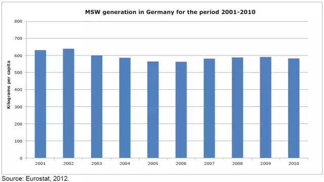 根據(jù)歐洲統(tǒng)計(jì)局的數(shù)據(jù),從2001年至2010年,德國(guó)的城市生活垃圾總產(chǎn)生量在5000萬噸左右浮動(dòng),但是人均垃圾產(chǎn)生量有所下降,從2001年的632kg/a(1.73kg/d)減少到2006年的564kg/a(1.55kg/d)。