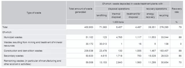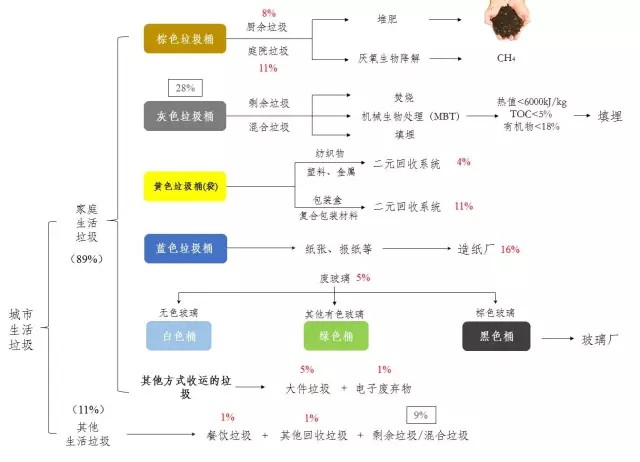按照產(chǎn)生來源,德國(guó)的城市生活垃圾(MSW)主要分為家庭垃圾和其他垃圾兩大類。家庭垃圾包括普通家庭生活垃圾、公共垃圾、大件垃圾(廢舊家具、家電等)、有機(jī)垃圾、可回收利用的垃圾(玻璃、廢紙、紙板、塑料、輕質(zhì)包裝材料、金屬等);其他垃圾包括街道清掃垃圾、菜場(chǎng)垃圾、其他混合生活垃圾等。