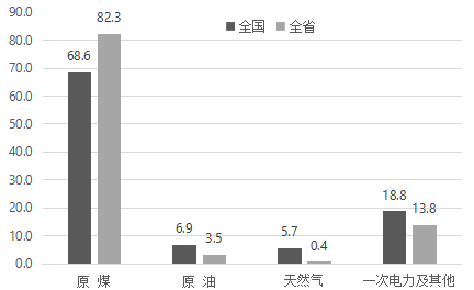 受能源自然稟賦影響,全省一次能源生產(chǎn)一直以煤炭為主,近年來,經(jīng)過煤炭行業(yè)供給側結構性改革,全省煤炭產(chǎn)量比重有所下降,但到2020年全省原煤產(chǎn)量仍占80%左右,原油、天然氣產(chǎn)量分別占3%左右和0.5%左右,一次電力及其他能源占16.3%,能源生產(chǎn)結構偏煤狀況沒有明顯改善。2019年,與全國平均水平相比,全省原煤產(chǎn)量占比高出全國13.7個百分點,原油、天然氣和一次電力及其他能源產(chǎn)量占比分別較全國低3.4個、5.3個和5.0個百分點。