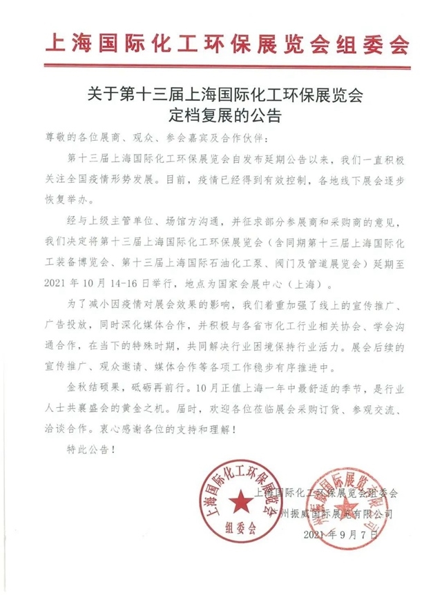 關(guān)于第十三屆上海國(guó)際化工環(huán)保展覽會(huì) 定檔復(fù)展的公告