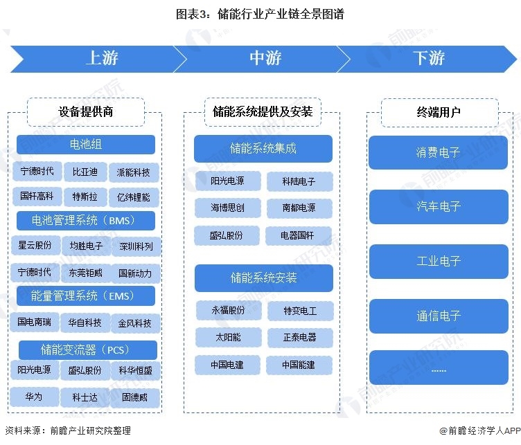 儲能產(chǎn)業(yè)鏈上游為電池、電池管理、能量管理系統(tǒng)以及儲能變流器供應(yīng)商;中游為儲能系統(tǒng)集成商、安裝商以及終端用戶等;下游為終端應(yīng)用客戶,包括風(fēng)/光/傳統(tǒng)電站、電網(wǎng)公司、家用儲能等。