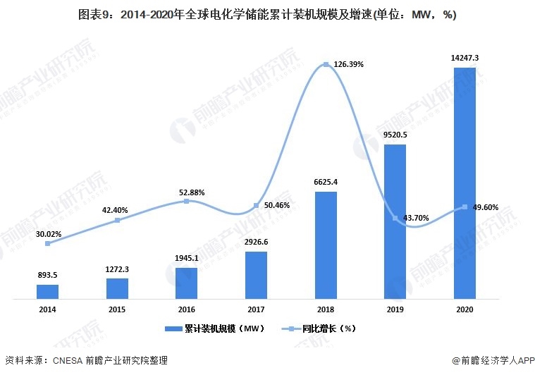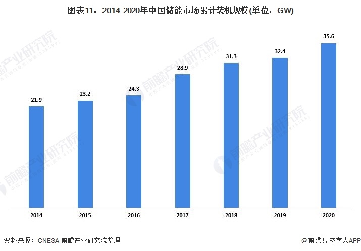 根據(jù)CNESA不完全統(tǒng)計,截至2020年底,中國已投運儲能項目累計裝機(jī)規(guī)模為35.6GW,占全球市場總規(guī)模的18.6%,同比增長9.8%,漲幅比2019年同期增長6.2個百分點。