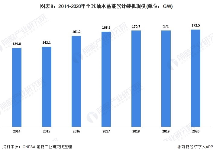 2015-2020年,全球抽水蓄能的累計裝機(jī)規(guī)模呈增長趨勢。截至2020年底,全球抽水學(xué)能累計裝機(jī)規(guī)模為172.5GW,同比增長0.9%。在全球儲能市場上占據(jù)領(lǐng)先地位。