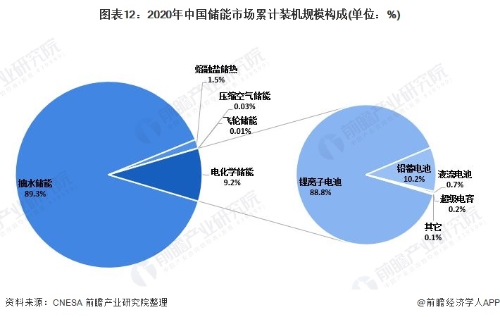 截至2020年底,在中國儲能市場中,抽水蓄能的累計裝機(jī)規(guī)模最大,占比達(dá)到了89.3%;其次是電化學(xué)儲能,裝機(jī)規(guī)模占比為9.2%。熔融鹽儲熱裝機(jī)規(guī)模占比為1.5%;壓縮空氣儲能和飛輪儲能裝機(jī)規(guī)模占比都小于0.1%。
